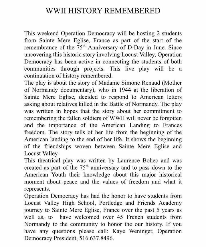 The rekindled Operation Democracy seeks to carry on the legacy from the original Operation Democracy (formed in 1947) from a humanitarian, non-partisan perspective through culture, education, children and the community of the hamlet of Locust Valley and the surrounding areas.