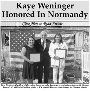 On Saturday, June 4th, during the annual week long ceremonies honoring D-Day Veterans in Sainte Mere Eglise, founding "Sister City" of Locust Valley; Kaye Weninger was the recipient of the first Maureen Kennedy Award, established to honor those Americans and French who have done most to promote positive Franco/American relations. Kaye shared the $10,000 prize with the A.V.A. (Amitie Veterans Americains) a group-founded post WWII by Simone Renaud, wife of the wartime Mayor of Sainte Mere Eglise and the subject of the recently completed documentary "Mother of Normandy".